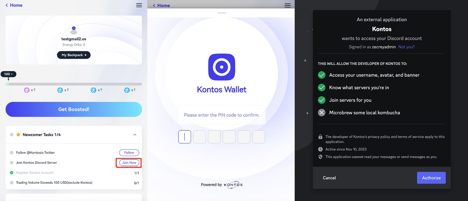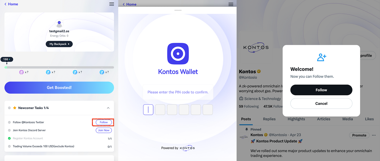 Complete these tasks by following Kontos’ Twitter, joining the Discord server and making your first transaction. Upon successful account creation, the third task is automatically completed. When trading volume surpasses $100, the fourth task will become unlocked.