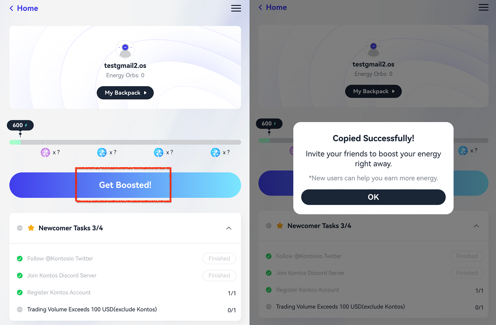 These tasks encourage users to invite friends to boost for them. You can share your boosting link to get help from friends, or click on your friend’s link to support them. When a new user registers a Kontos account using your boosting link and completes the newcomer tasks, both you and the invitee will receive a specific energy value. Additionally, as the inviter, you will benefit from a share of the transaction fees generated by your invitees. The system allocates 10% of these fees to first-level inviters (direct inviters) and 5% to second-level inviters (those who invited the first-level inviters). This tiered incentive structure rewards both direct and extended network engagements.